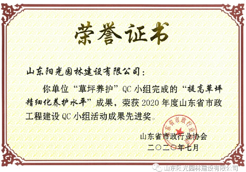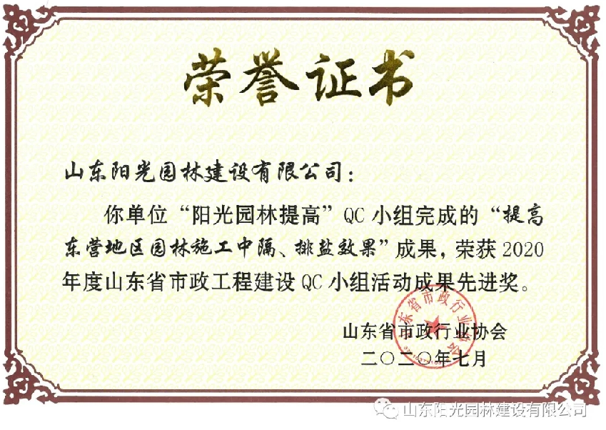 近日,由山東省市政工程協會主辦的2020年度市政工程建設優秀QC小組活動成果獲獎情況揭曉,我公司申報的《提高東營地區園林施工中隔、排鹽效果》、《提高草坪精細化養護水平》、《提高減少移栽苗木緩苗期》三個小組課題榮獲“QC小組活動成果先進獎”。