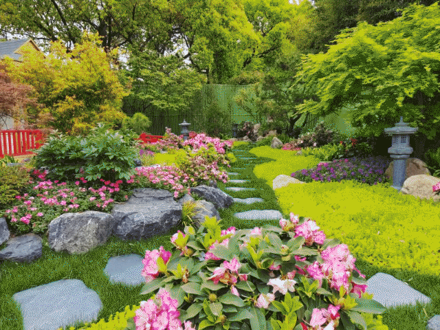 其中,“月河印象”依檐而出、傍水而設,擺放上木桌椅、石缸、石槽等,搭配上芍藥花、美女櫻,展現出了春季主題植物的艷麗花姿;“芍華歸處”清風徐來,花自盛開,萬紫千紅只等你,錦繡婀娜綻芳華;“幸福人家春常在”粉墻黛瓦,花開正艷,茶香混合著花香襲人而來,沁人心脾;“甲府庭院”石景與水景依傍而生、交相呼應,展現了一處日式庭園特色山水景觀......展園風格多種多樣,精彩紛呈。