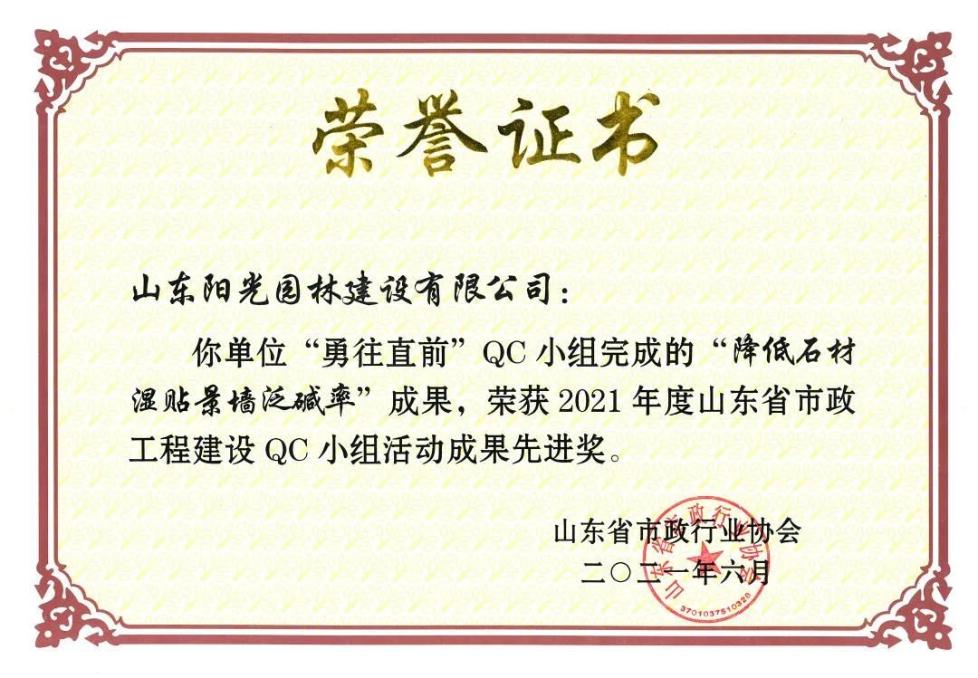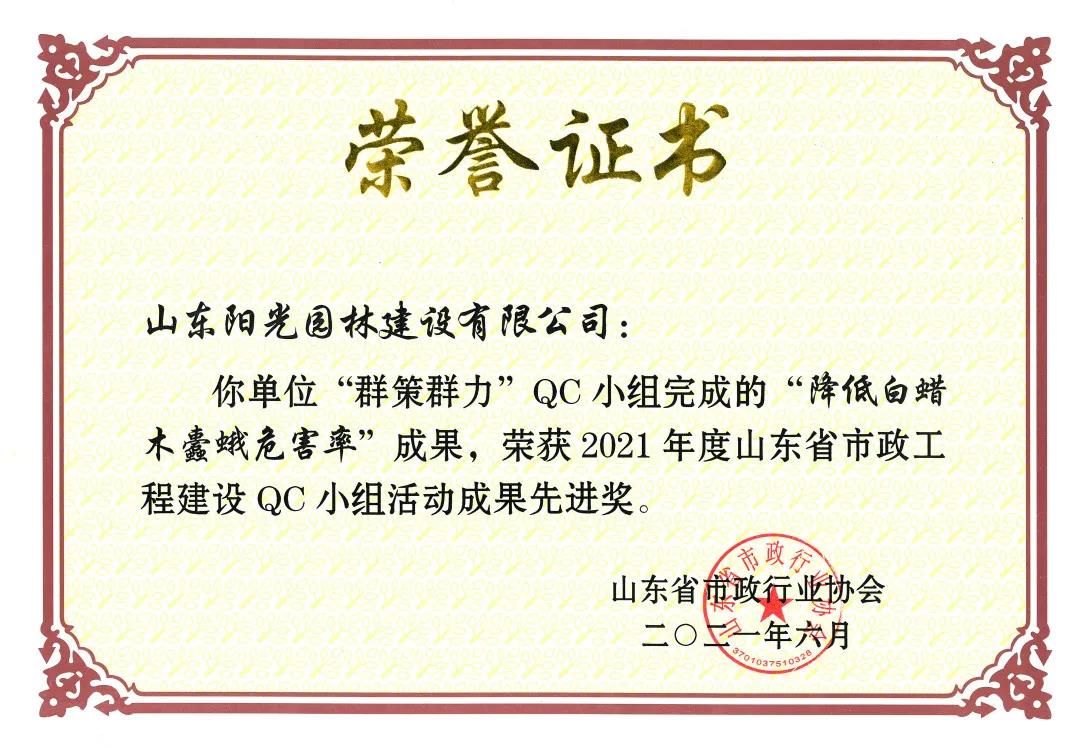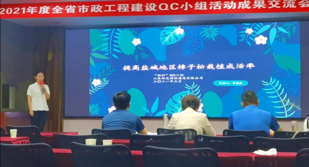 近日,由山東省市政工程協會主辦的“2021年度全省市政工程建設QC小組活動成果交流會”在濟南召開,陽光園林申報的四項QC成果喜獲佳績,其中《提高鹽堿地區樟子松栽植成活率》課題榮獲“QC小組活動成果一等獎”,《降低石材濕貼景墻泛堿率》、《降低白蠟木蠹蛾危害率》及《提高播種草坪成坪率》課題榮獲“QC小組活動成果先進獎”。