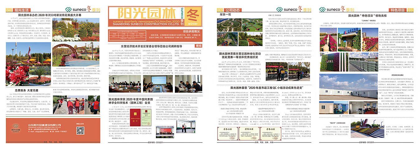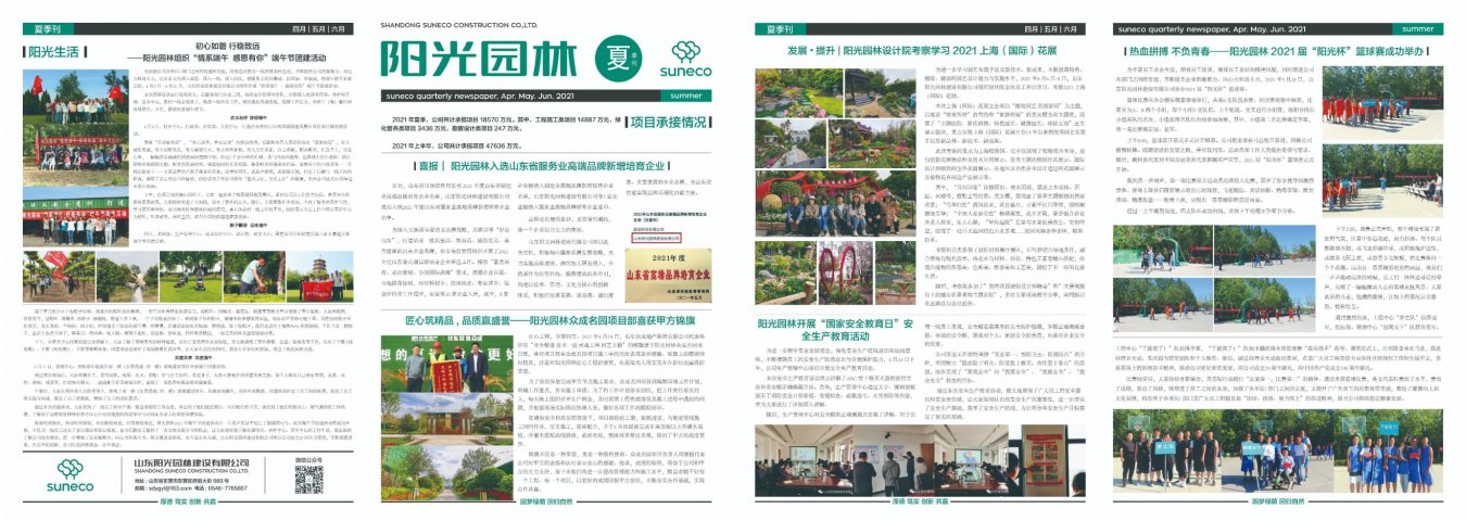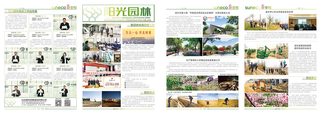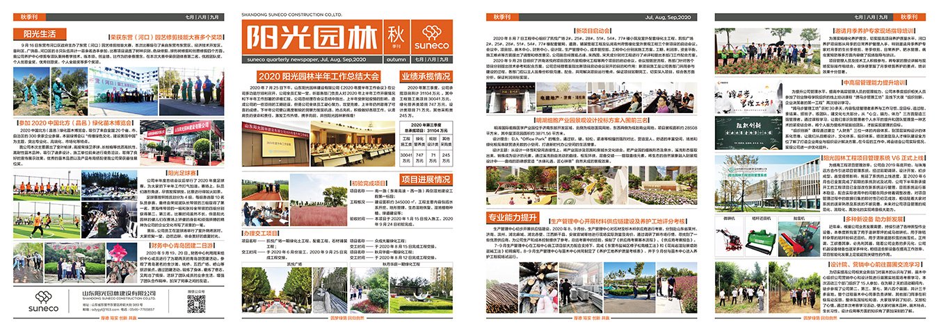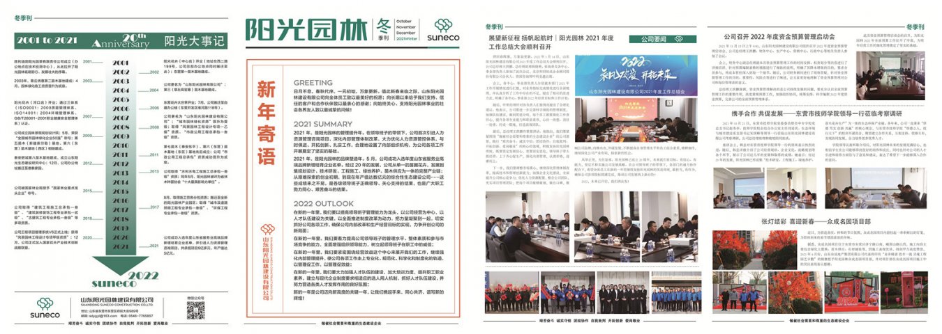 企業內刊是企業文化建設的有效平臺,是企業上下交流互動的主要載體。為更好的宣傳企業文化,樹立良好的企業形象,打造具備文化內涵的品牌形象,為員工提供一個展示才華、交流思想的平臺,公司創辦《陽光園林》季刊。